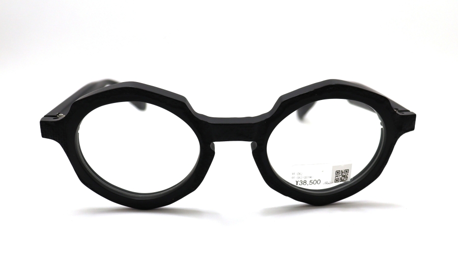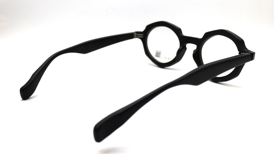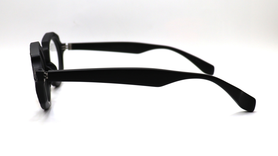多角形のリムに、レンズ形状は大きめのオーバルシェイプが特徴的なRF-062。RF-060番台の特徴である表面処理を施し、レンズ周辺部をマット仕様に、その周りにRF-061で採用した布目の立体転写技術を用いてアセテートに新たな表情を生み出した。複雑で手の込んだ工程を経て、味のあるフレームに更なる表情が加わり、独特な存在感を醸し出している。